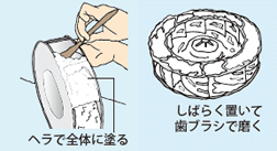 クリームクレンザーをヘラなどで全体に塗り、5分~30分ほどおいて汚れが分解されたら、歯ブラシなどで磨き、汚れをこすり落としながら水で洗い流します。